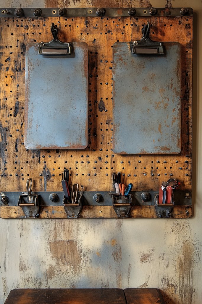 Keeping notes, deadlines, and supplies organized can be a challenge. Rustic metal clipboards and pegboards offer a practical yet stylish solution. They provide easy access to your essentials and add a touch of vintage industrial charm. It’s a clever way to stay organized without clutter.