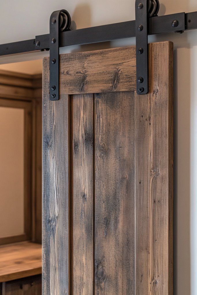 Imagine a reclaimed wood barn door sliding on black iron hardware, set against weathered brick or shiplap walls. The door’s rustic finish complements other farmhouse elements in your space. When closed, it creates a cozy, private nook; when open, it opens up the room. It’s both functional and a statement piece.