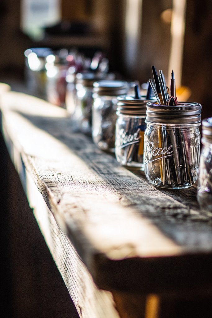 Purchase a variety of mason jars from a hardware or craft store. Wash and dry thoroughly before decorating. Use chalkboard paint or adhesive labels to personalize each jar. Fill them with your favorite pens, brushes, or small office supplies. Arrange the jars on a decorative tray or mounted wooden plank to keep everything within reach. You can also add small pebbles or fabric liners at the bottom for extra stability.