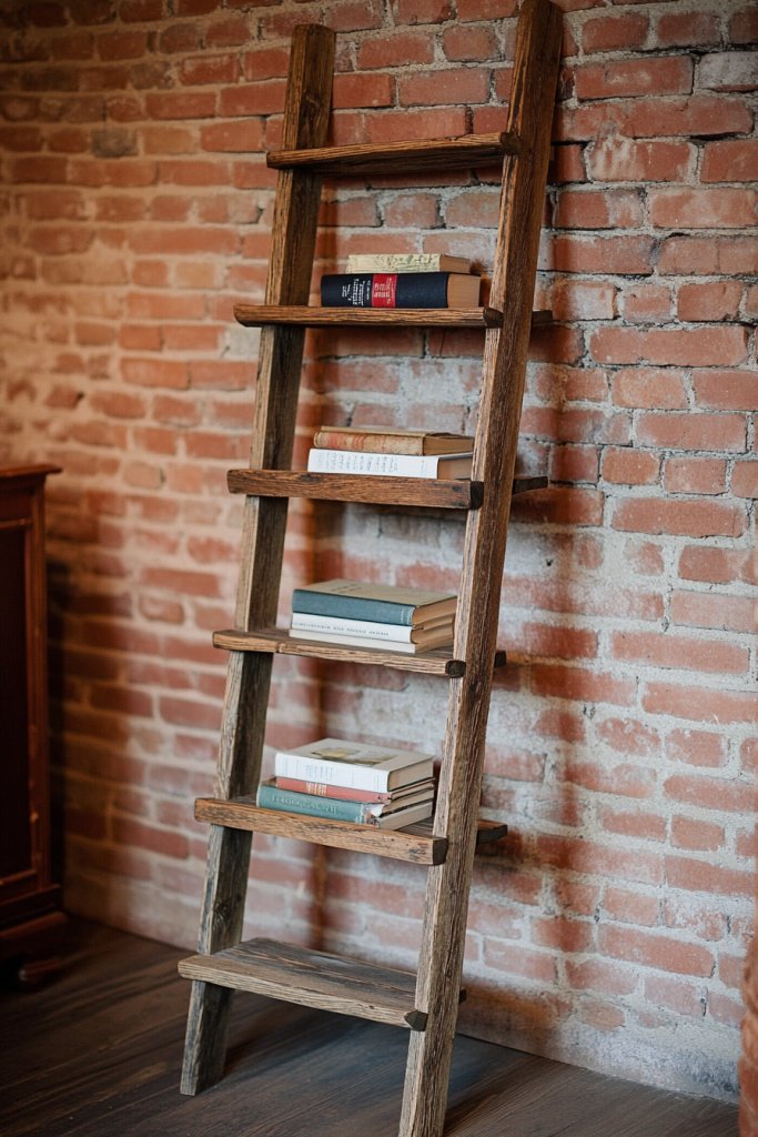Envision a weathered wooden ladder leaning against a wall, with each rung holding neatly stacked books, baskets, or decorative items. The wood’s natural grain and chipped paint give it a lived-in farmhouse appeal. Small potted plants, vintage ceramics, or framed photos sit atop the ladder for a layered, curated look. It’s a statement piece that’s both practical and pretty.