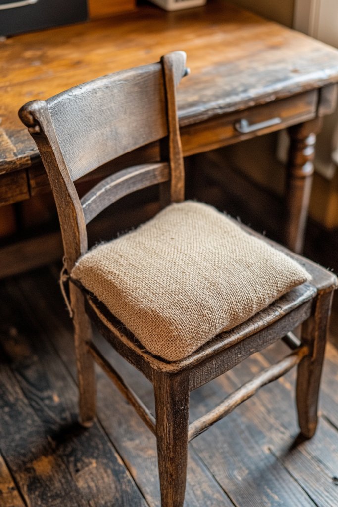 Choose a sturdy wooden or metal-frame chair with a vintage or distressed finish. Sew or buy burlap cushions, adding ties or decorative buttons. Attach the cushion to the seat with safety pins or staples if needed. Place the chair in your workspace and adjust the cushion for comfort. You can also add non-slip pads to prevent sliding.