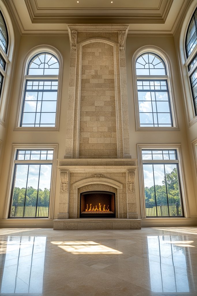 Choose stone finishes ranging from rough-hewn to smooth, depending on your style. You can add decorative details like carved accents or a detailed mantelpiece above the arch. The side windows can be replaced with stained or leaded glass for an even more historic feel. Smaller rooms might benefit from a scaled-down, simpler arch with matching side windows.
