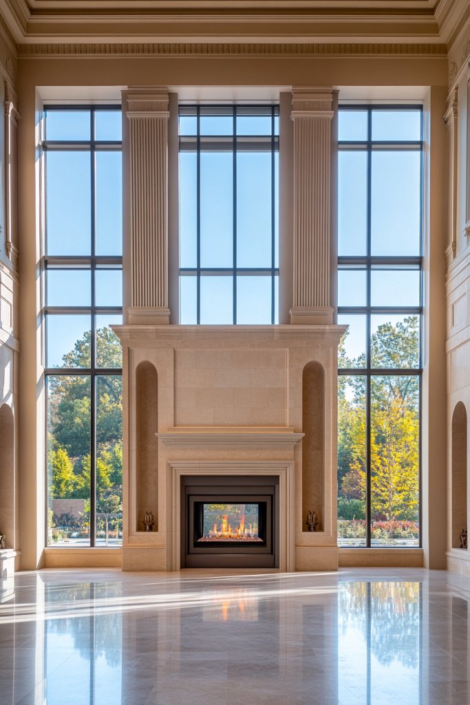 Imagine a central fireplace set into a wall with built-in niches on either side, perfect for displaying art, sculptures, or decorative objects. Floor-to-ceiling picture windows flood the space with natural light, framing views of the outdoors or cityscape. The fire’s glow highlights the surrounding niches, creating a layered, gallery-like atmosphere. This setup is both functional and highly aesthetic.