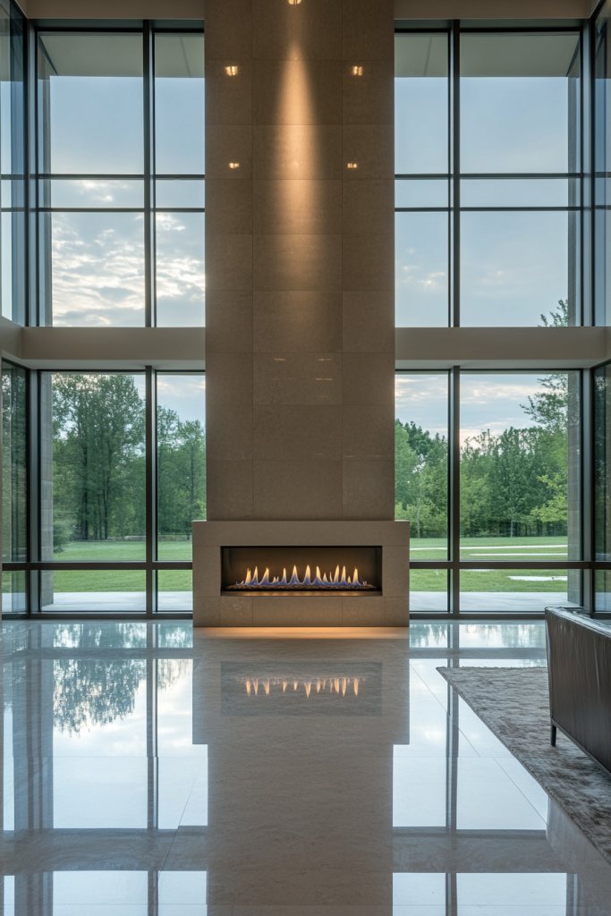 Want a fireplace that feels upscale and polished? A tiled hearth paired with expansive floor-to-ceiling glass windows can create a luxurious focal point. It’s ideal for modern homes aiming for elegance and sophistication. If you love sleek surfaces and a reflective glow, this idea elevates your space instantly.