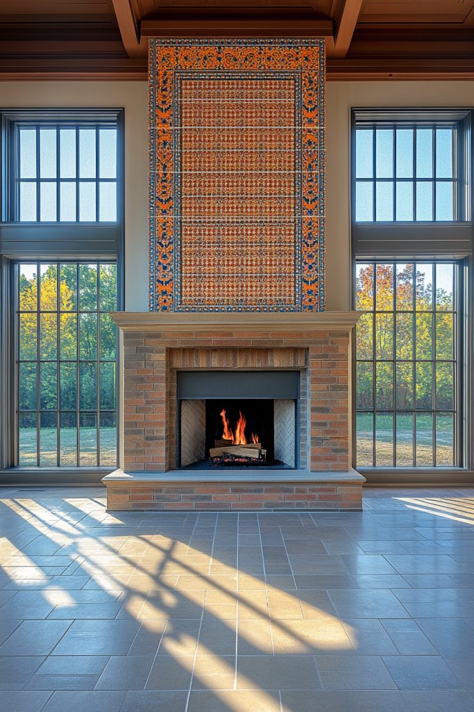 Imagine a robust masonry surround, clad in vibrant or textured tiles—think geometric patterns, metallic accents, or mosaic designs. Flanking it, expansive side windows flood the room with daylight and frame scenic views. The fire glows in front of the tiled surface, creating a dynamic, artistic backdrop. This setup combines craftsmanship with visual drama.