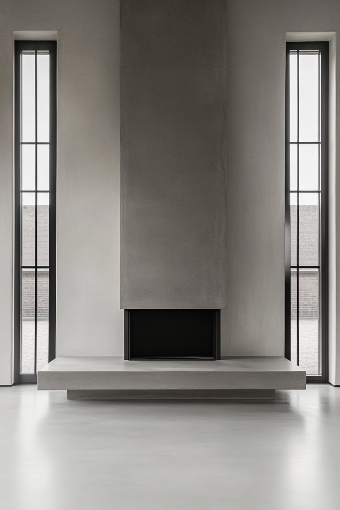15. Minimalist Concrete Fireplace with Slim Windows and Monochrome Palette
