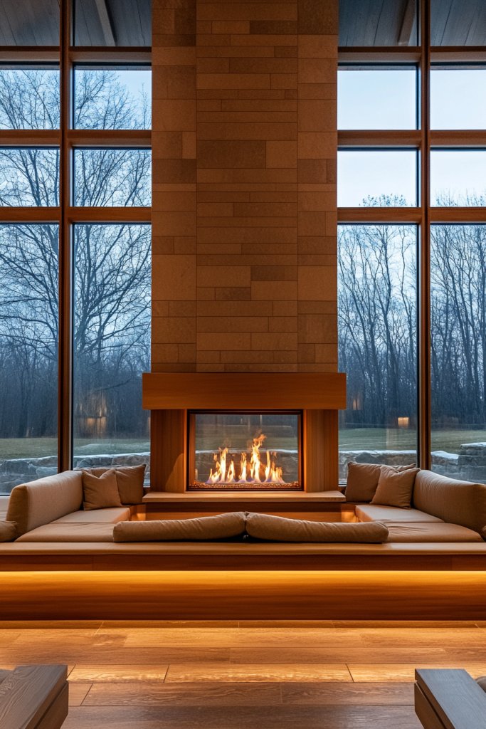 Want a cozy lounge spot that invites relaxation? Combining a fireplace with built-in seating and large windows creates a perfect retreat within your home. It’s ideal for those who love to unwind, read, or entertain friends in a warm, inviting space. If comfort and style are your priorities, this idea is a game-changer.