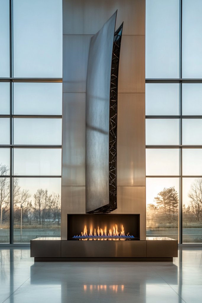 Imagine a fire feature framed by intricate, custom-made metal sculptures—think abstract forms, geometric patterns, or flowing organic shapes—crafted from steel or copper. Large glass windows on either side flood the space with light, highlighting the artistic details. The fire flickers behind or within the sculptures, creating a dynamic interplay of light and shadow. It’s a masterpiece in your living room.