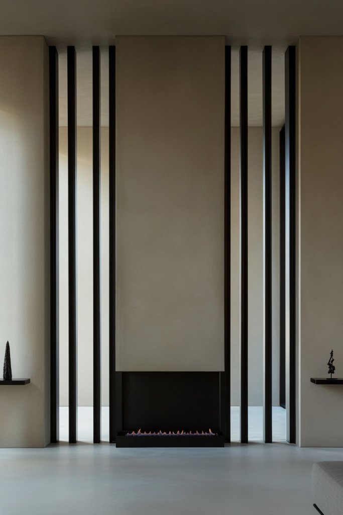 2. Modern Minimalist Fireplace with Slim Black Frames and Narrow Windows