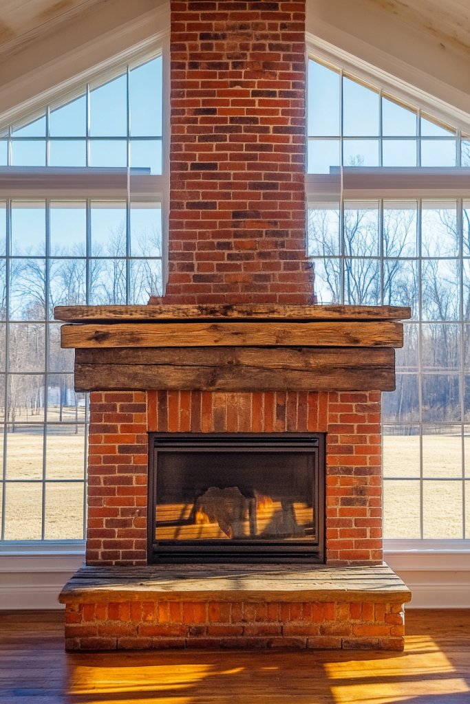 3. Rustic Brick Fireplace with Reclaimed Wood Mantel and Panoramic Windows