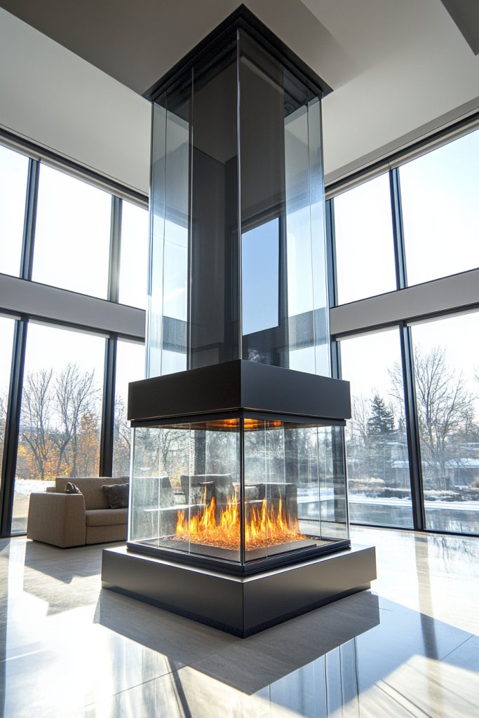 4. Double-Sided Fireplace with Glass Panels and Floor-to-Ceiling Windows