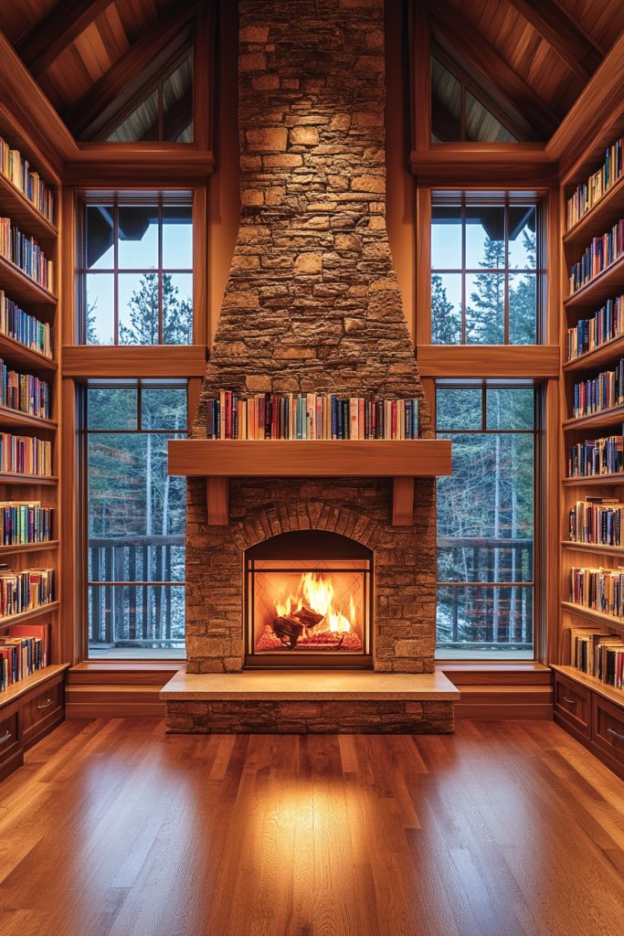 Picture a traditional brick or stone fireplace nestled within custom oak or painted shelving units that reach up to the ceiling. Flanking the fireplace, massive side windows flood the space with daylight, highlighting the shelves and creating an open, bright environment. Soft throws and plush armchairs complete this cozy, sophisticated look. The fire flickers gently, adding warmth and ambiance to your literary sanctuary.