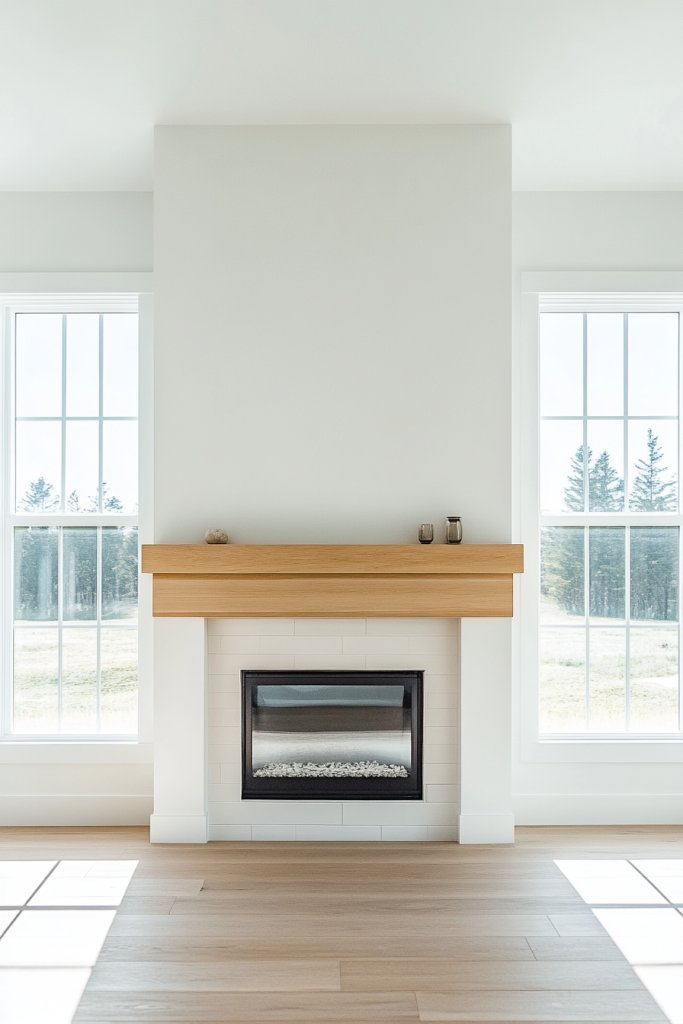 Visualize a sleek, simple fireplace with a smooth, white plaster surround paired with a floating light wood mantel. On each side, tall, narrow windows with white frames invite in soft daylight, creating a bright and inviting setting. The fire’s gentle glow reflects off the white walls, enhancing the tranquil environment. Subtle textures like a soft cream throw blanket or woven baskets complete this peaceful, Scandinavian aesthetic.