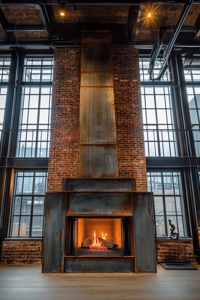 7. Industrial Fireplace with Metal Finish and Large Steel-Framed Windows