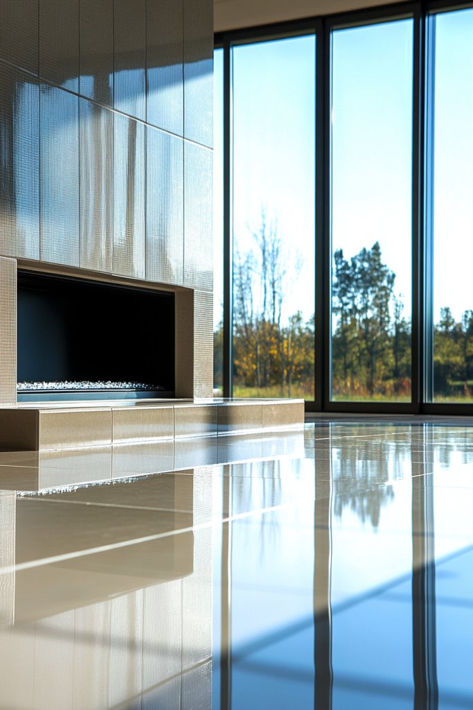 Envision a spacious hearth adorned with glossy, textured, or mosaic tiles—perhaps in shades of gold, black, or marble-like finishes. Flanking the fireplace, massive glass panels stretch from floor to ceiling, offering unobstructed views and filling the room with light. The flickering fire reflects off the polished tiles, creating a shimmering, opulent atmosphere. This setup combines glamour with comfort seamlessly.