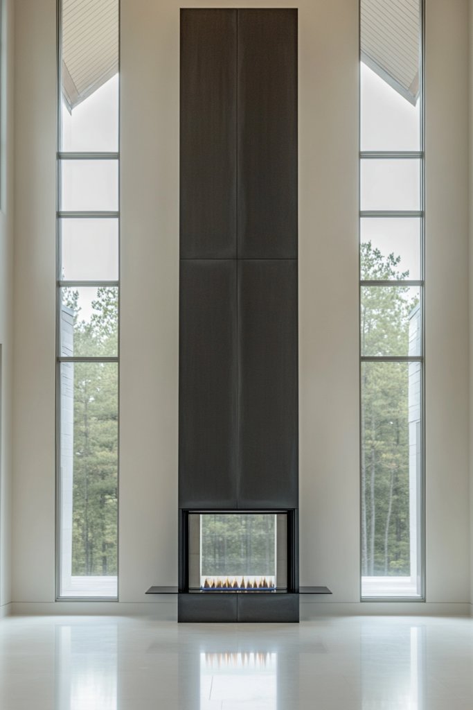 Visualize a narrow, rectangular fireplace embedded seamlessly into a wall painted in matte white or soft gray. Flanking it, thin black-framed windows stretch vertically, allowing shafts of natural light to pierce through. The contrast between the dark frames and the light wall creates a striking, contemporary aesthetic. The fire’s glow softly illuminates the surrounding surfaces, enhancing the room’s sleek appeal.