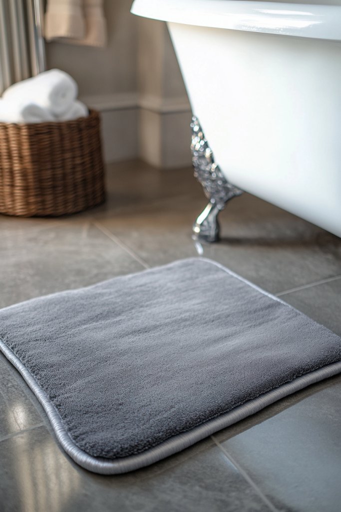 Imagine a plush, textured rug in a muted grey tone placed just outside your shower or vanity. The tactile weave invites your feet and adds visual depth to the floor. Its subtle pattern and soft fibers contrast beautifully with sleek tiles or concrete surfaces. The neutral color ensures it complements rather than competes with your overall decor.