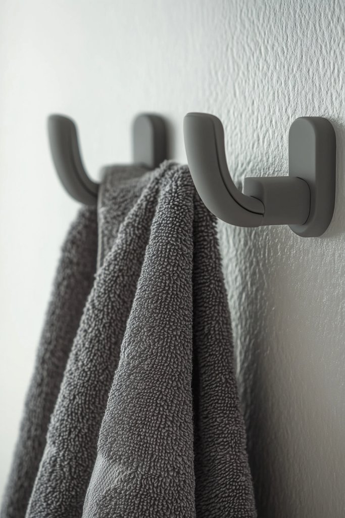 Imagine matte grey hooks mounted flush against a wall, holding plush towels or robes. Their simple, clean lines complement the surrounding tiles and fixtures, creating a uniform aesthetic. The neutral color ensures they don’t distract from more prominent design elements. Tactile and understated, they add to the sense of order and calm in your bathroom.