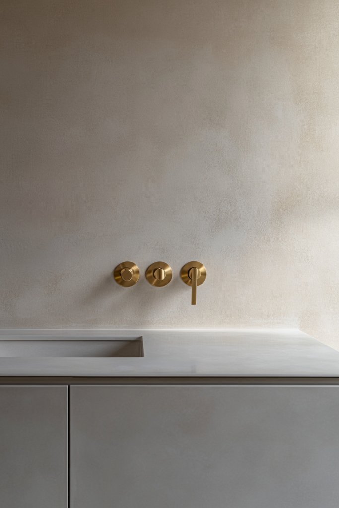 Picture a streamlined vanity in a soft, airy grey tone sitting against a clean wall. The smooth, matte surface contrasts beautifully with shiny brass handles and fixtures, adding a luxurious feel. The subtle hue brightens the room without overpowering it, creating an inviting environment. The minimalist design keeps clutter hidden, emphasizing simplicity and quality craftsmanship.