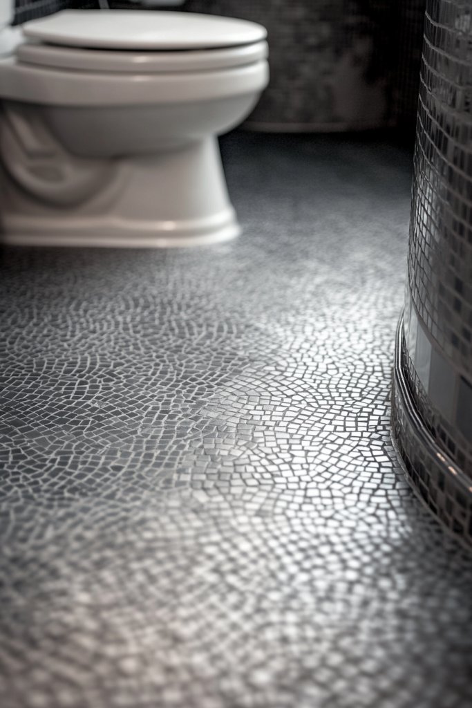Imagine walking into a bathroom where the floor features a mosaic of tiny grey tiles arranged in intricate geometric shapes. The pattern catches light from multiple angles, creating a mesmerizing effect. The neutral tones balance the busy pattern, preventing it from overwhelming the space. It feels both modern and timeless, grounding the entire room.