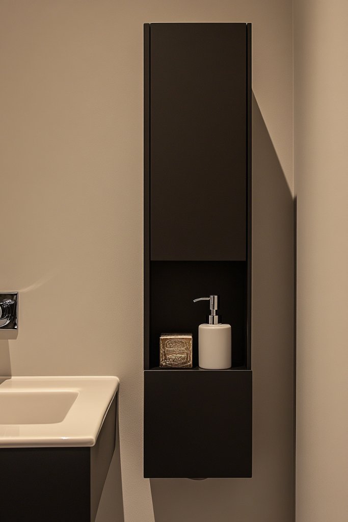 A sleek wall-mounted cabinet hides toiletries out of sight while maintaining a modern aesthetic. Use attractive materials like wood, metal, or textured laminates to add visual interest and warmth.