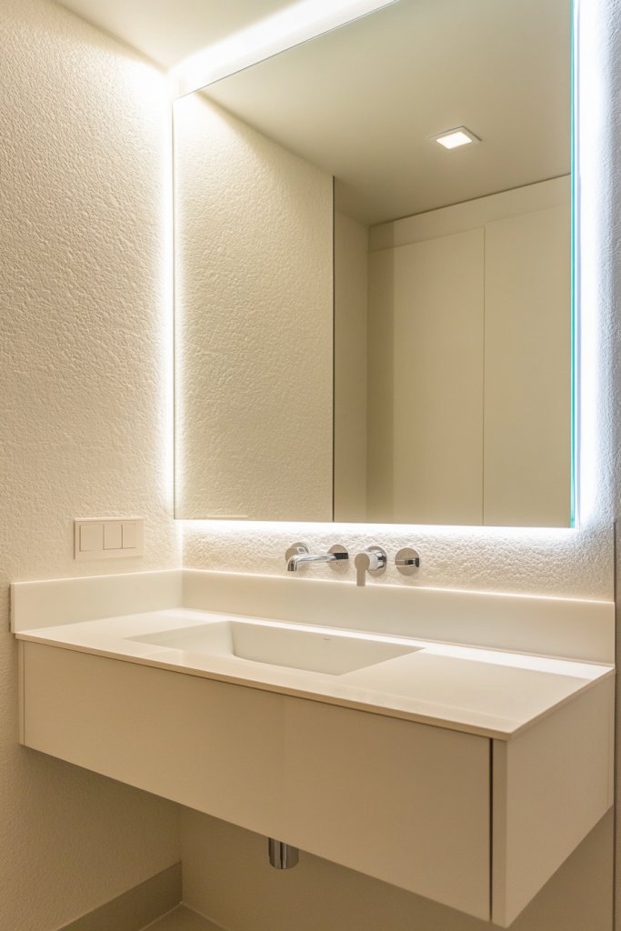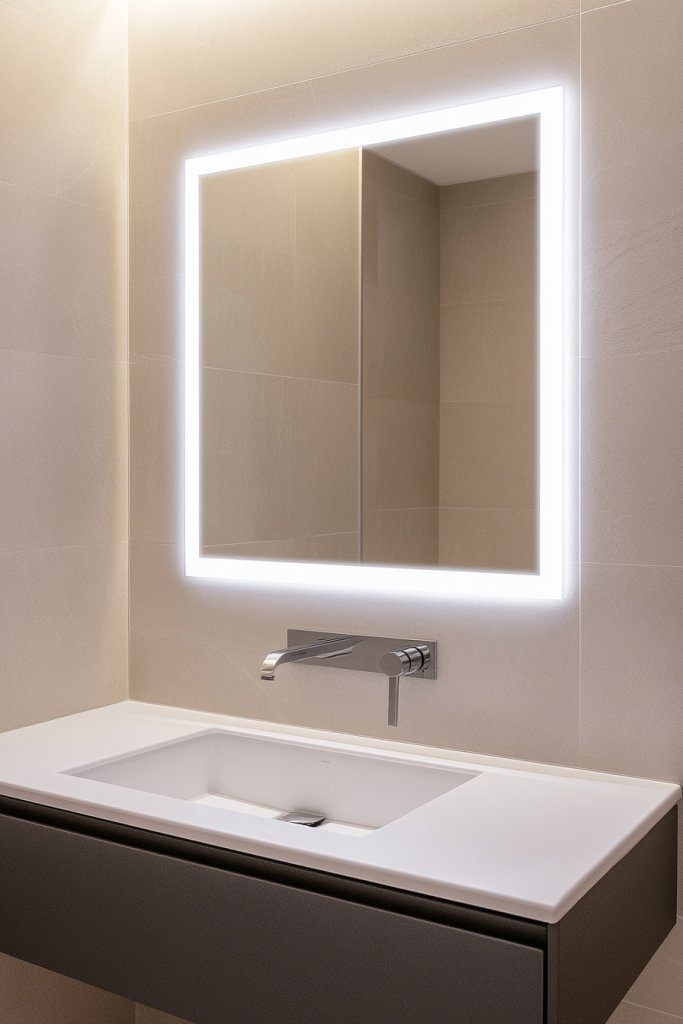 Personalize by choosing lighting color temperatures or adding a few decorative elements around the mirror. Incorporate a small shelf or tray integrated into the mirror’s frame for everyday essentials.