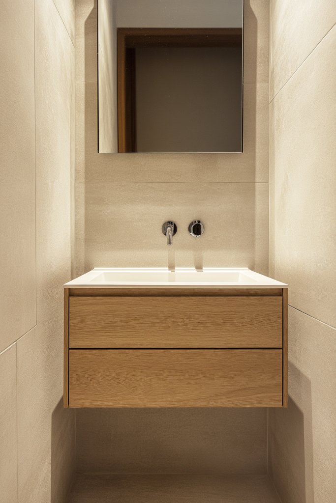 Consider installing a mirrored cabinet above for storage and style, but keep it sleek. Small decorative trays or containers on the counter can organize toiletries without clutter.