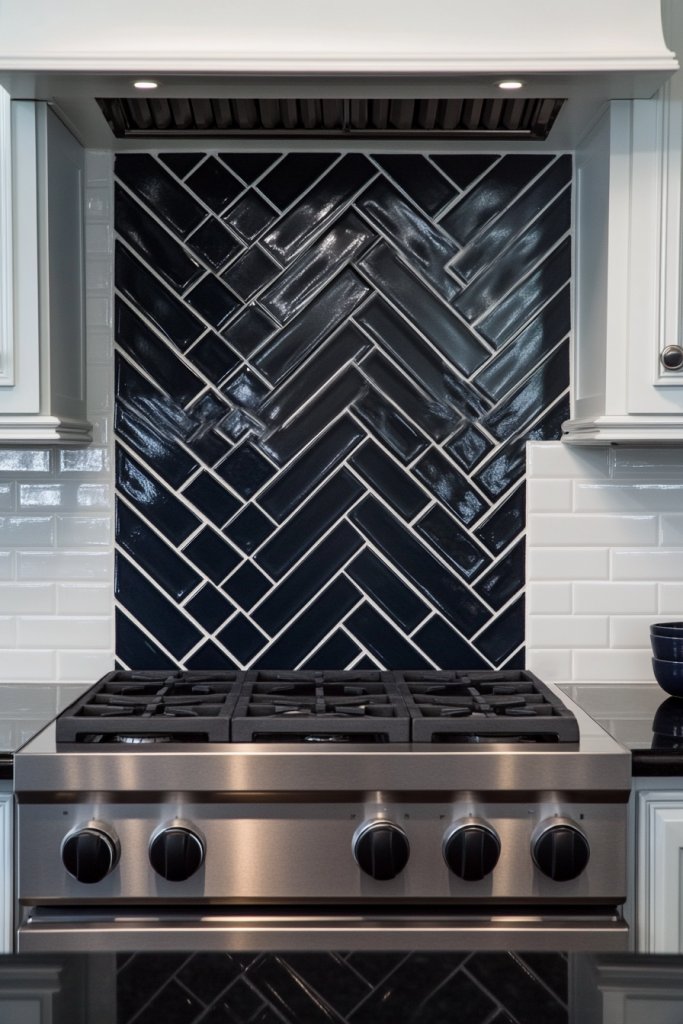 Want to add a touch of sophistication and playfulness to your backsplash? Monochrome tiles in various sizes arranged in a herringbone pattern create dynamic visual interest without sacrificing elegance. It’s a clever way to keep things simple yet captivating.