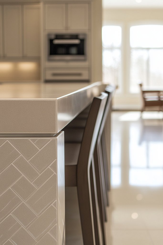 Picture soft gray tiles with a textured surface that catches light at different angles, creating gentle shadows and highlights. The textured finish adds tactile appeal and visual complexity, making the pattern more engaging. The subtle variation in tone helps hide smudges or water spots, keeping your kitchen looking fresh longer. It’s like a quiet hero of design.