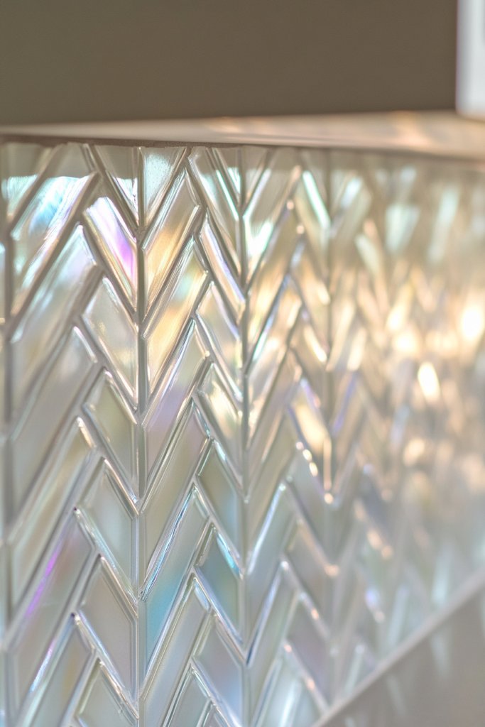 Picture transparent or lightly tinted glass tiles arranged in a zigzag pattern that captures and reflects every bit of light. The smooth, glossy surface amplifies brightness and adds depth, making the room feel more expansive. The pattern’s clean lines give it a crisp, sophisticated look that enhances any decor style. It’s like having a mirror on your wall, but way more stylish.