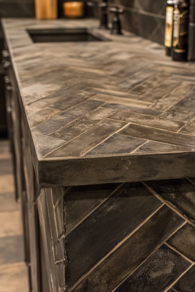 Craving an edgy, industrial vibe that’s durable and stylish? Textured cement tiles in a herringbone pattern combine toughness with artistic flair. They add character and a vintage-inspired touch that stands out in any space.