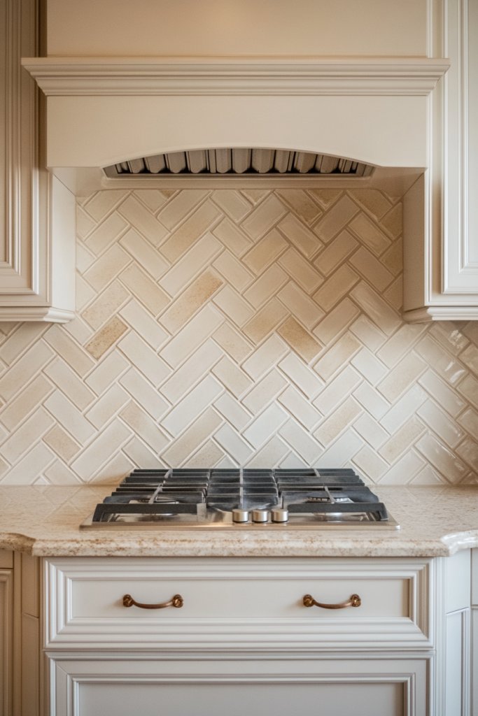 Craving a cozy, nostalgic vibe in your kitchen? Vintage-inspired cream and biscuit-colored tiles in a herringbone pattern evoke warmth and charm reminiscent of farmhouse or cottage styles. They create a welcoming atmosphere that feels timeless and inviting.