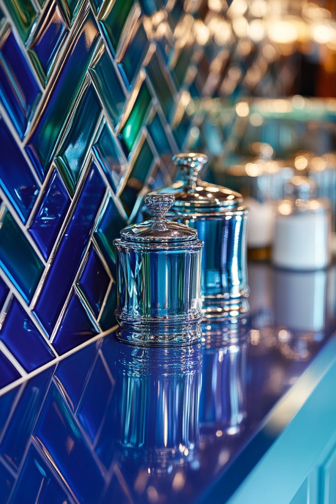 Create a custom color story by selecting tiles that represent your personality. Incorporate metallic or iridescent tiles for extra flair. Use nearby textiles or art in similar hues to enhance the artistic vibe. Layer with lighting that highlights the variety of textures and colors.