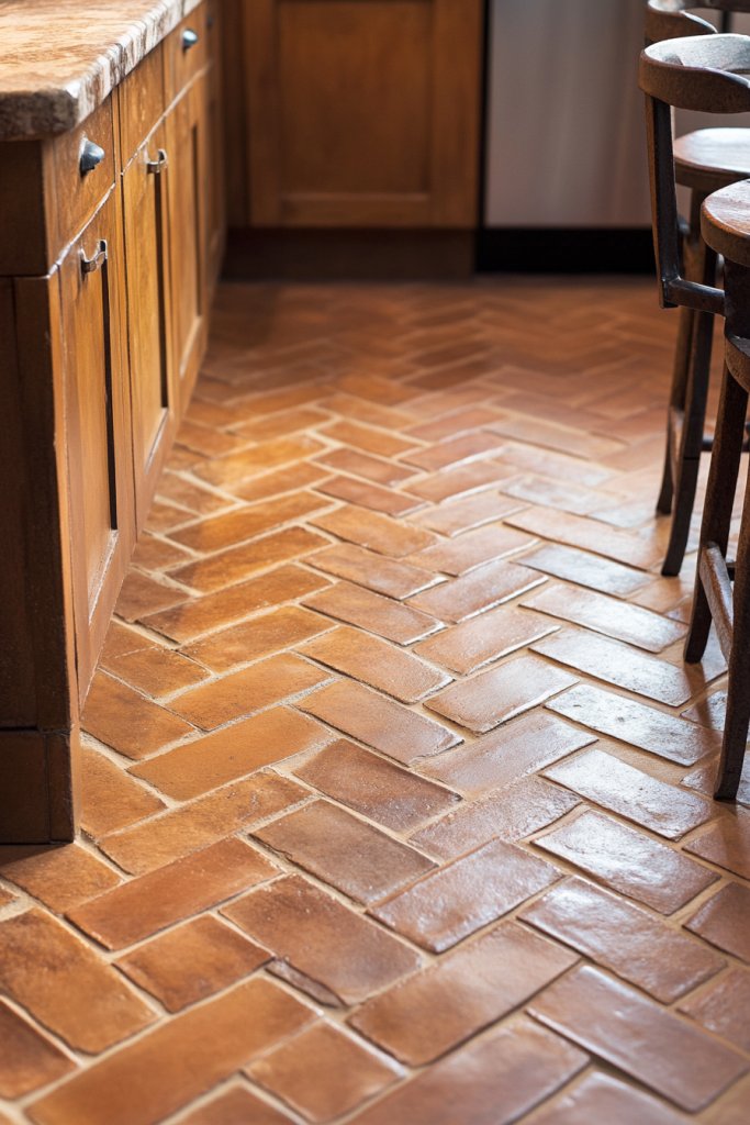 Craving a rustic, earthy vibe that feels warm and inviting? Textured clay tiles laid in a herringbone pattern can give your space a handcrafted, Mediterranean charm. They add tactile richness and a sense of tradition to any room.