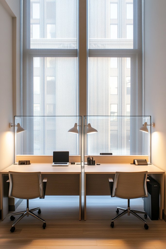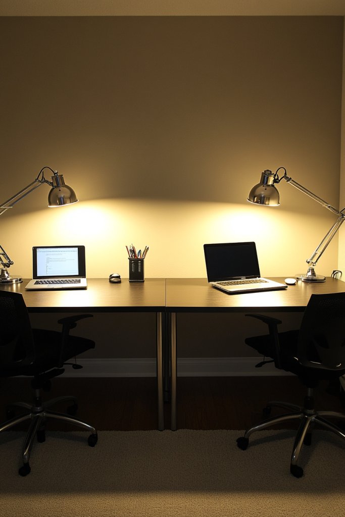 Imagine adjustable desk lamps with flexible arms and focused LED bulbs illuminating each workspace precisely where needed. The light casts a warm glow over your papers or keyboard, highlighting details without glare. With sleek, modern fixtures, the lighting complements your decor, while soft, diffused bulbs create a cozy atmosphere. The setup feels both functional and inviting, reducing eye fatigue and boosting your mood.
