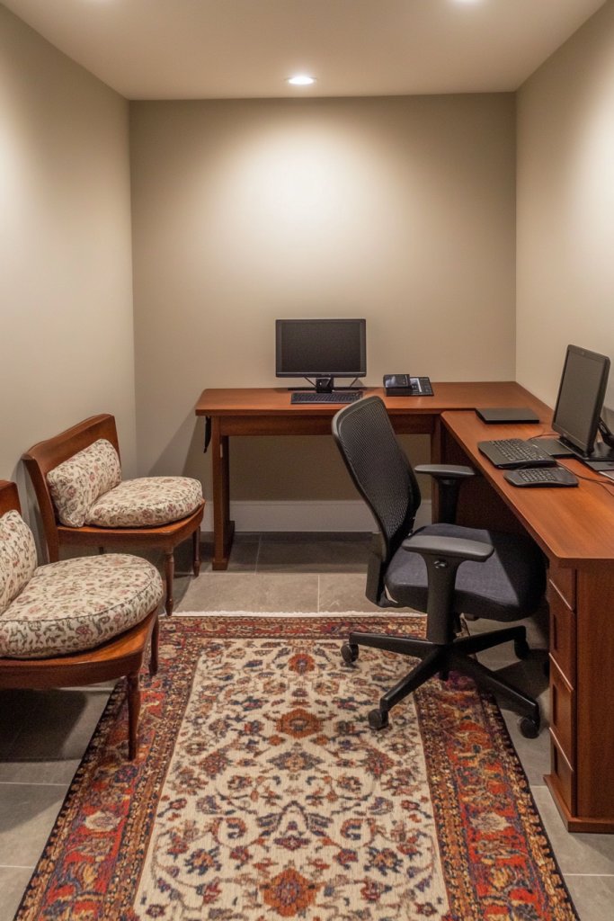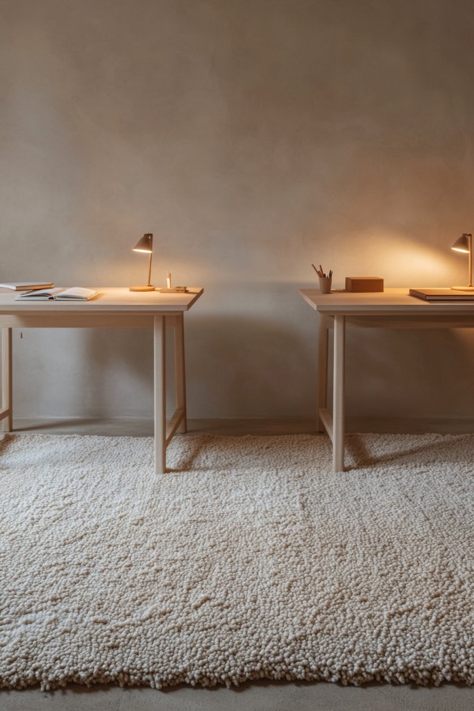 Visualize a plush, textured rug under your desk in a rich, neutral tone. The tactile surface feels soft underfoot, balancing the sleekness of your furniture. Patterned or woven textures add depth, creating a layered look that feels warm and welcoming. The rug anchors your workspace, making it look intentional and cozy, almost like a boutique hotel suite. It’s a subtle but powerful way to elevate your environment.