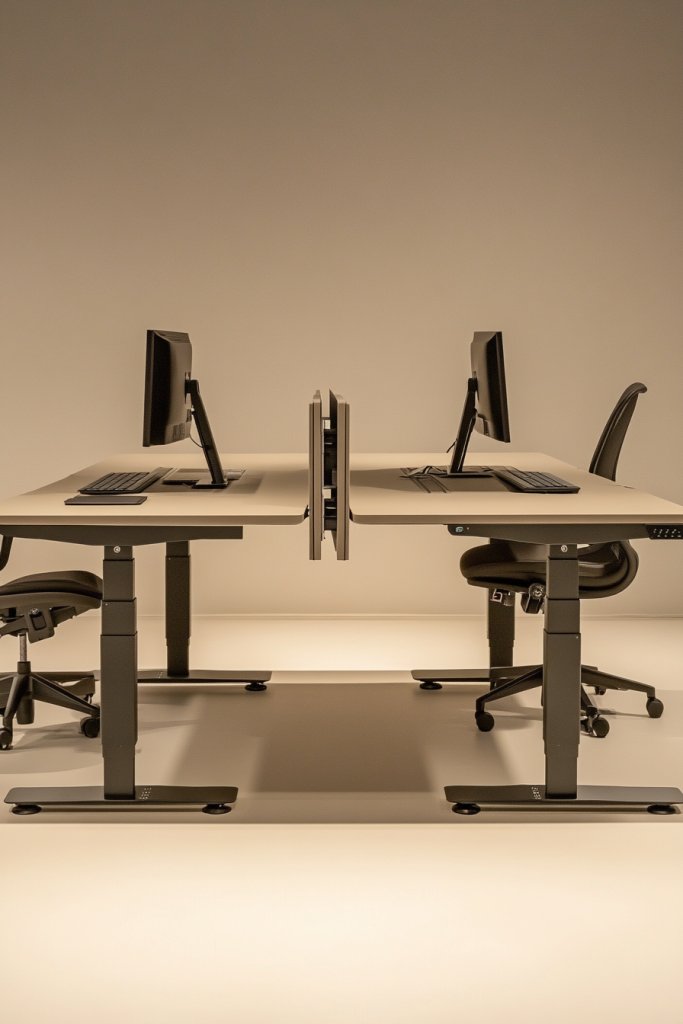 Imagine a sleek sit-stand desk with a smooth, motorized mechanism. You can easily raise or lower the surface with just a press of a button, customizing your height for comfort. The desk surface stays level, with a modern, minimalist design that fits seamlessly into any decor. The transition from sitting to standing is smooth, almost like gliding into a healthier posture. It’s a workspace that moves with you.