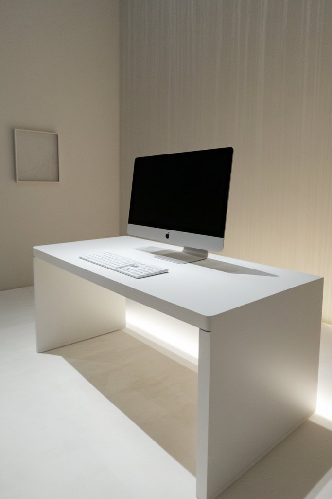 Picture a sleek, streamlined desk with a smooth surface and clean lines, free of bulky drawers or accessories. The color palette is neutral—white, black, or soft wood tones—that creates a sense of calm. Minimalist accessories like a simple pen holder or a slim monitor stand keep things tidy. The overall effect is a workspace that feels spacious, organized, and inspiring.