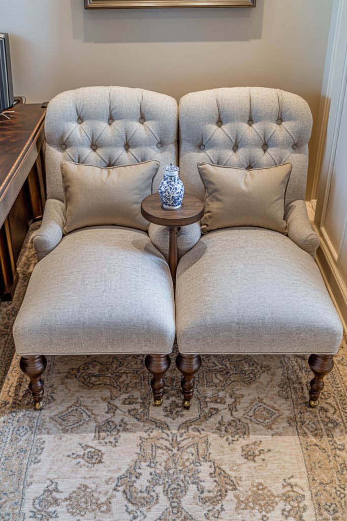 Choose furniture that fits your space—think a compact loveseat, a pair of armchairs, or even a textured pouf. Use textured textiles like knit throws or woven cushions for comfort. During different seasons, swap out covers or add decorative pillows in seasonal colors. For a more modern look, stick with clean lines and neutral tones, or add warmth with textured fabrics and cozy textures.