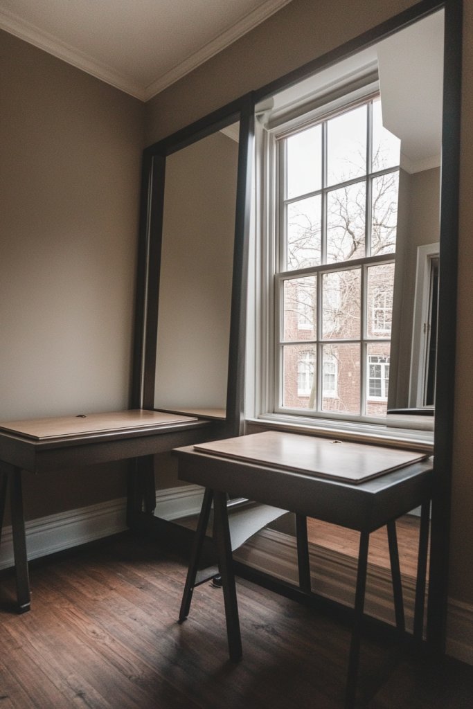 Imagine a large, framed mirror mounted on the wall opposite your window, reflecting sunlight and your workspace. The mirror’s sleek frame complements your decor, adding depth and brightness. The reflected space creates an illusion of expansion, making the room feel more open and inviting. Surrounded by textured wall finishes or minimalist decor, the mirror becomes a focal point that transforms your environment.