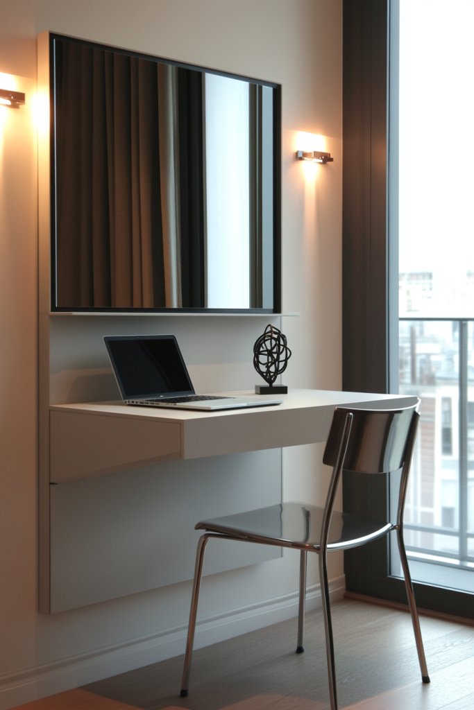 Choose a wall-mounted desk with a slim profile for a minimalist look, or opt for a fold-out surface with built-in storage compartments for more functionality. Consider a desk with a fold-up shelf or a hidden drawer for essentials. During different seasons, you can add decorative wall coverings or textured paint to enhance the visual appeal. This setup adapts easily to various room styles, from industrial to Scandinavian.
