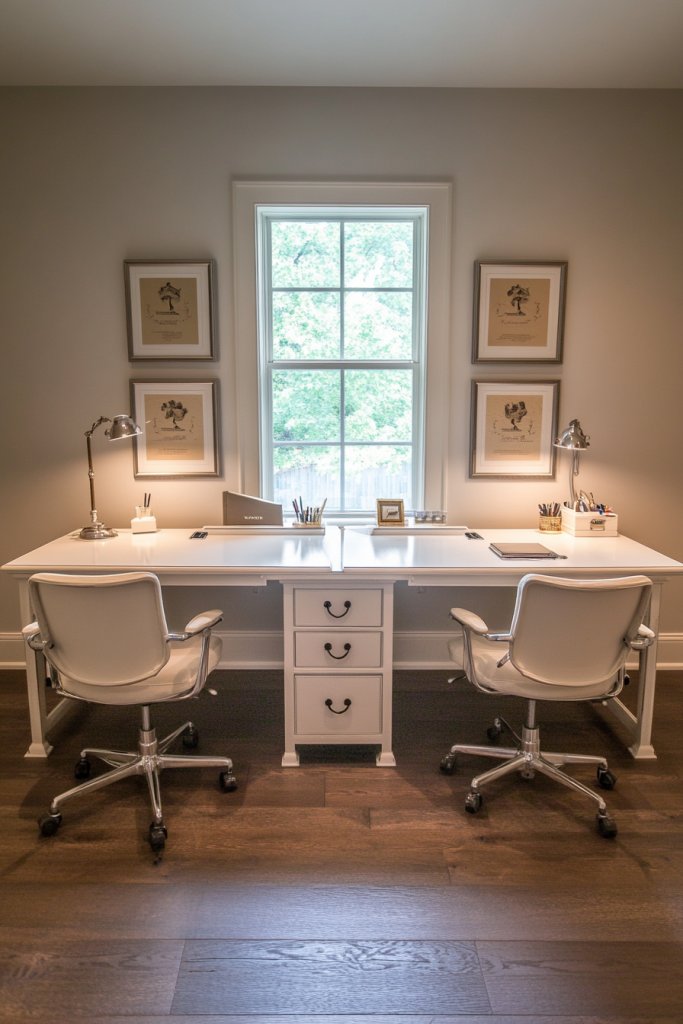This setup proves that smart design can turn even the smallest spaces into productive havens. It encourages shared work without sacrificing individuality. Ready to create a balanced, stylish workspace that’s both functional and fun? Embrace the versatility of dual desks and transform your home office into a space you’ll love spending time in.