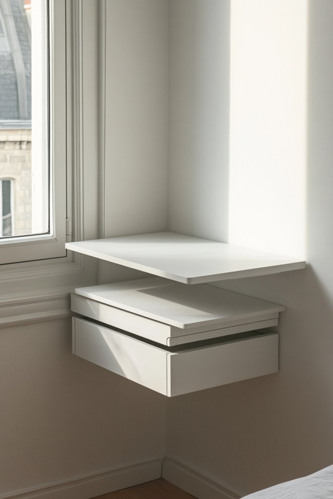 Imagine a slim, wall-mounted panel in a soft matte finish, floating effortlessly above your rugs or wooden flooring. The desk’s surface is smooth, with a subtle lip to keep items from sliding off. Beneath, built-in drawers or open shelves hold supplies, neatly concealed yet within arm’s reach. The area feels airy, light, and organized—like your own minimalist haven.