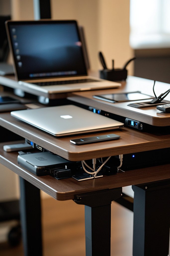 Imagine a sleek, modern desk featuring multiple tiers—one for your laptop, another for accessories or papers, and perhaps a small shelf for your phone or tablet. Integrated power outlets and USB ports are seamlessly built into the surface, ready for your devices. The design keeps cords hidden and accessible, with a clean, clutter-free look that invites productivity and focus.
