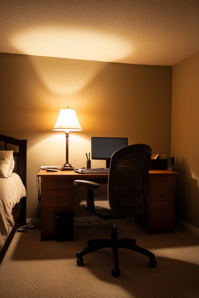 Struggling with harsh or insufficient lighting in your bedroom workspace? Layered lighting with task and ambient sources creates a cozy, functional environment. It’s perfect for late-night work sessions or relaxing breaks. Who says your home office can’t be warm and inviting?