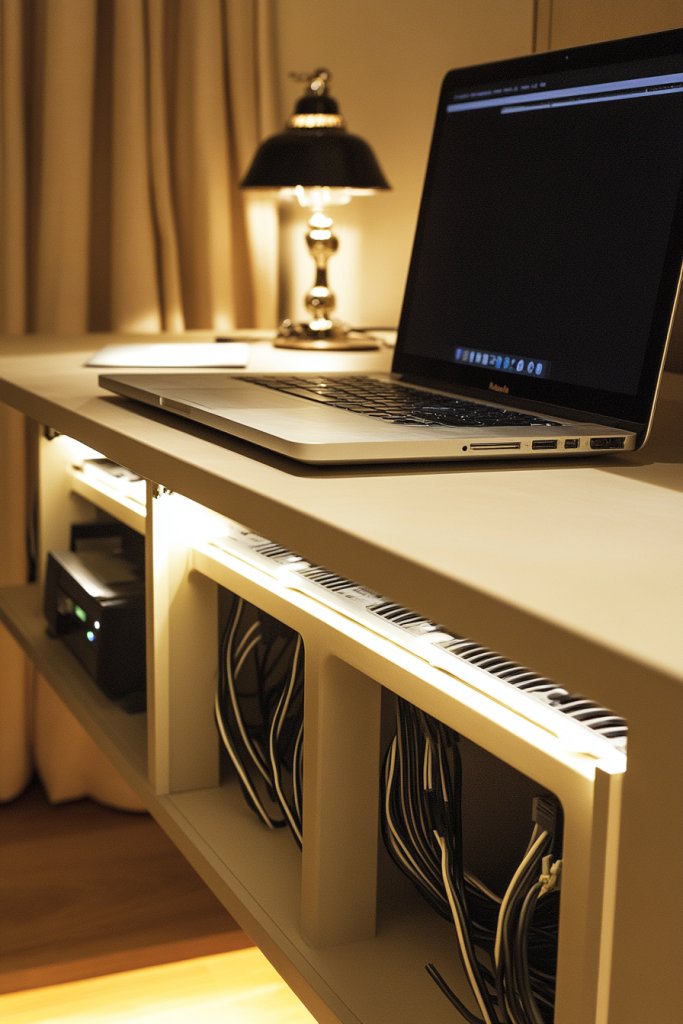 Imagine a sleek desk with discreet channels, clips, or sleeves built into the surface or edges. Cables run neatly behind or underneath, hidden from view but easy to access when needed. The surface remains clear, with only essential devices in sight. The setup looks clean, modern, and clutter-free, making your workspace more inviting.