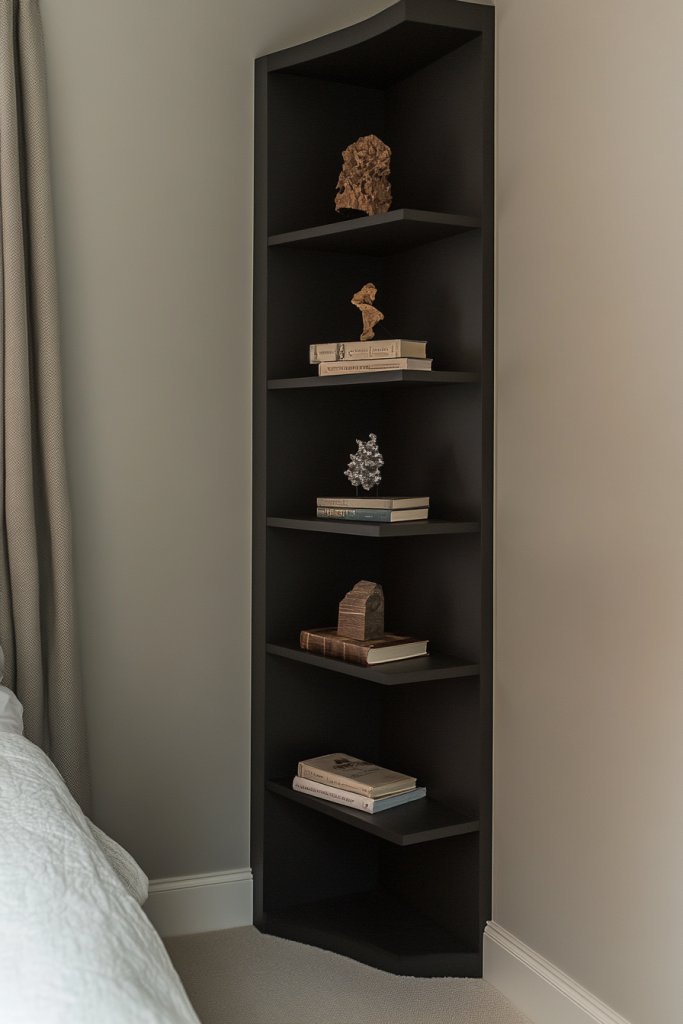 Visualize tall, narrow shelves in a sleek black or warm wood finish, placed between your bed and desk. They reach upward, emphasizing vertical space while adding texture and dimension to the room. Small baskets, boxes, or neatly stacked books fill the shelves, creating a curated look. The space feels organized yet open, with items displayed in a way that’s both functional and decorative.