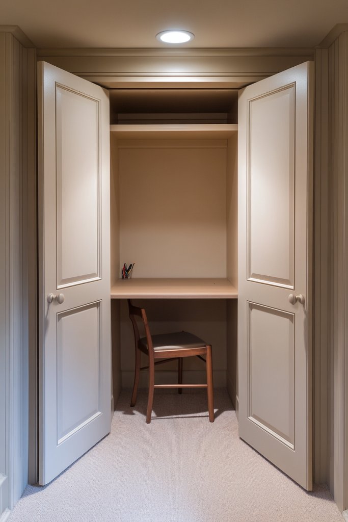 Picture a small closet with a fold-down desk inside, camouflaged behind a door or curtain. When open, it reveals a tidy work surface with a slim chair tucked inside. Concealed storage compartments hold supplies, kept out of sight but within reach. When closed, the space looks like a simple wardrobe, blending seamlessly into your bedroom decor.