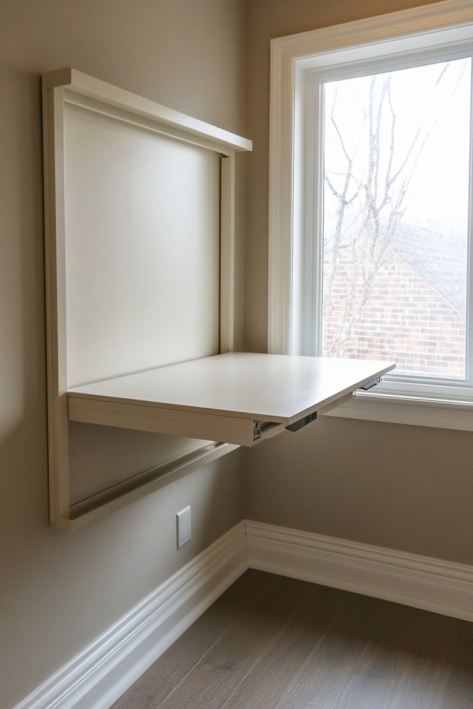 Imagine a sleek wall panel in a neutral hue, seamlessly blending into your decor. When folded down, it reveals a sturdy work surface, ready for your laptop or creative tools. When folded up, it transforms into a decorative panel, maintaining your aesthetic. The space feels open and uncluttered, with the desk hidden but accessible at a moment’s notice.