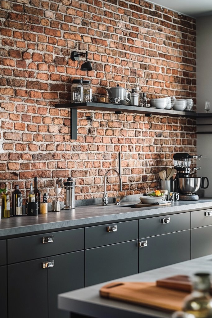 Complement the brick with industrial-style lighting fixtures or metallic accents to amplify the vibe. Use open shelving or sleek cabinets to balance the rough texture with modern storage.